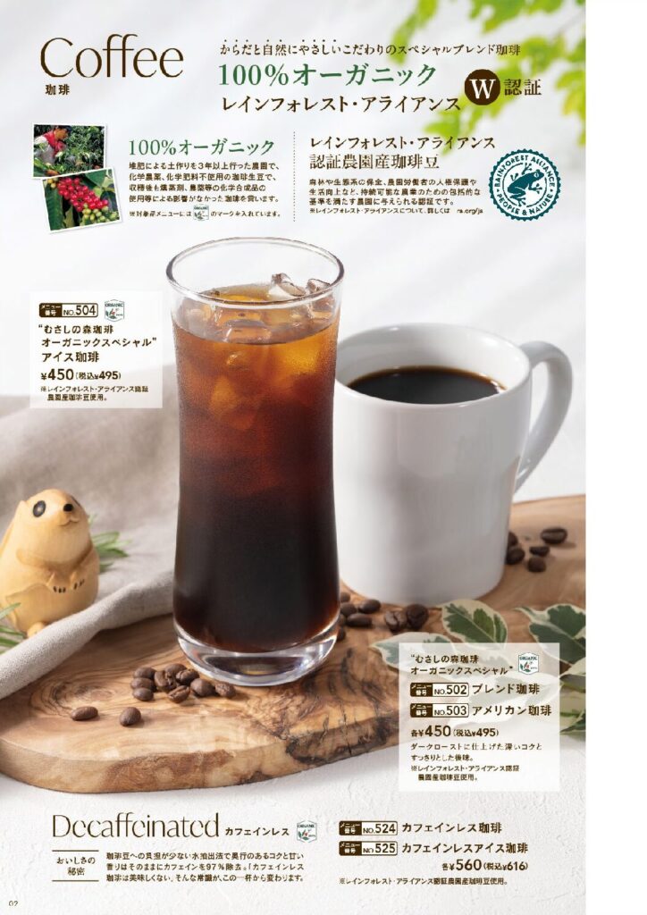 特に人気の「オーガニックコーヒー」は、香り高い豆を使用し、苦味と酸味のバランスが絶妙です。1杯目を飲み終えたあとに、もう一度ゆっくり味わいたいと思う人も多く、おかわりを注文するリピーターが多いのも特徴です。おかわり時には新しいカップで提供され、常に温かく香りが立った状態で楽しめます。このように、単なる“量”ではなく“質”を大切にしているのがむさしの森珈琲らしい点です。